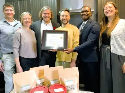 To celebrate the win, Brandon City Mayor Jeff Fawcett and Brandon Chamber of Commerce Membership Coordinator Godspower Utawure presented Living Simply Kitchen with an award certificate and the business received a fabulous Fair Trade coffee break for their workplace.
