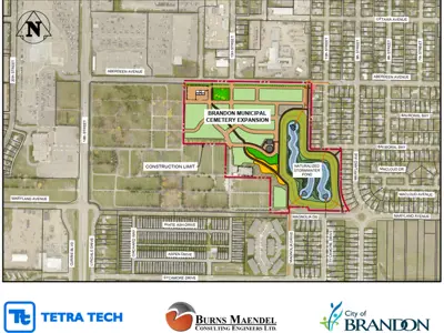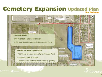 In 2025, construction will begin on the Brandon Municipal Cemetery Naturalized Stormwater Pond and Drainage Project. This project is part of the Southeast Brandon Drainage Improvement Project and a strategic action in the City of Brandon’s Climate Action Plan. This new stormwater retention pond, designed in accordance with the City of Brandon Naturalized Stormwater Pond Guidelines, will be constructed on the east side of the Brandon Municipal Cemetery grounds and will deliver many benefits including improved stormwater management. The pond will become a community amenity, providing habitat and opportunities for social connection, and will also enable the expansion of the cemetery and the future achievement of the Cemetery Master Plan.