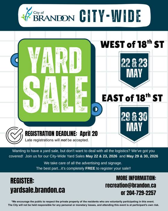 One of Brandon’s favourite spring traditions is back! The City‑Wide Yard Sale is your chance to declutter, discover hidden gems, and explore neighbourhoods across the city. Whether you're hosting a sale or hunting for bargains, it’s a weekend you won’t want to miss.