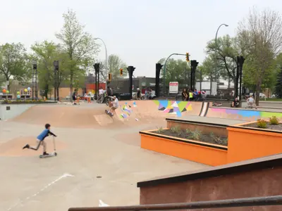 The Brandon Skate Plaza Group, in partnership with the City of Brandon, has successfully completed the development of a skate plaza in downtown Brandon. The plaza has seating areas, trees, and landscaping, that welcome non-active users who are there to watch participants. The location (the former site of the Prince Edward Hotel) has served as a cornerstone in the development of Brandon and the skate plaza will add to the rejuvenation of this location of the city. This is truly a community project with the benefits trickling down to many citizens in the City of Brandon and the surrounding area.