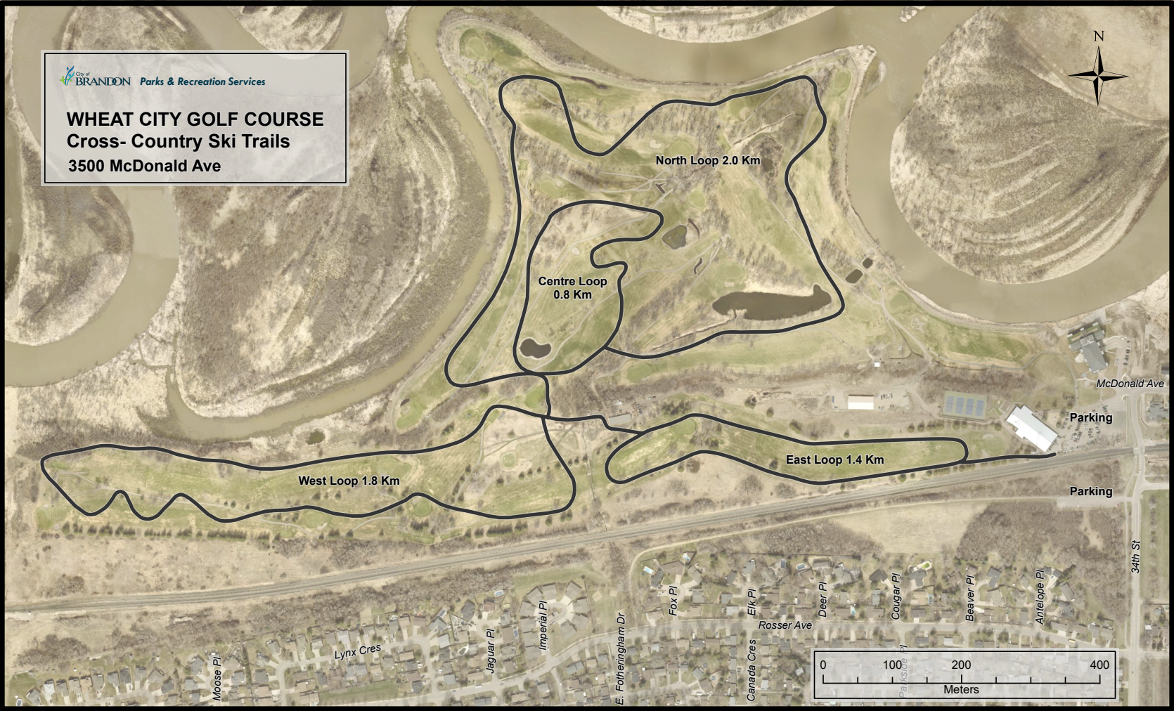 A cross-country ski trail system for public use can be found at the Wheat City Golf Course/Recreation Centre at 3500 McDonald Avenue. The City of Brandon's Parks & Recreation Services maintains the trail system on the property, which consists of approximately 6.6 kilometres of groomed trail.
